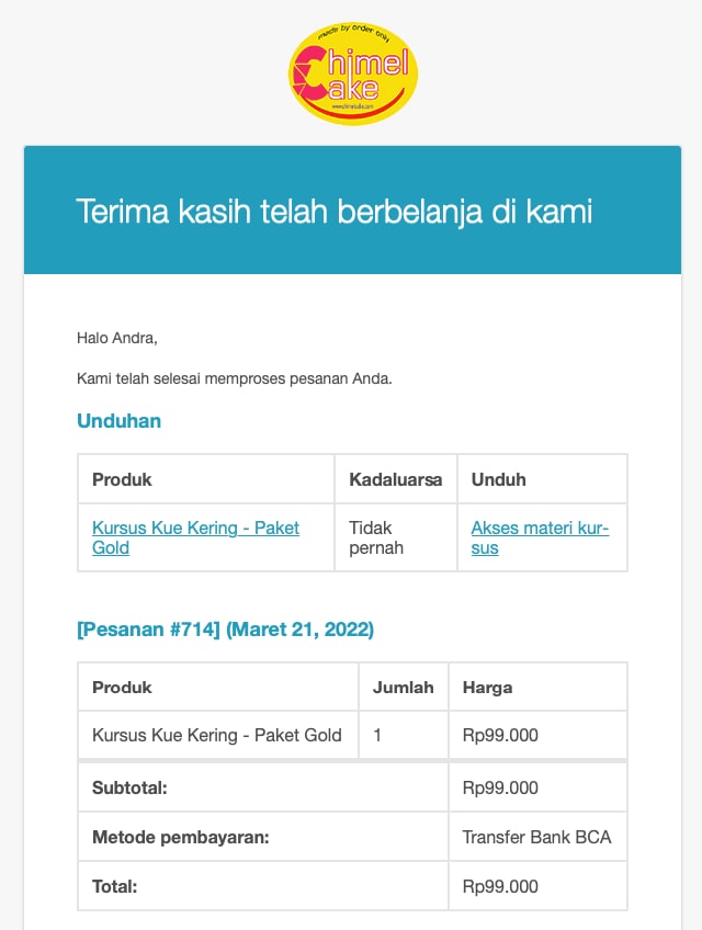 Harap diperhatikan, untuk mengakses materi kursus kamu diharuskan login terlebih dahulu ke member area. Silahkan login dari https://kursus.chimelcake.com/my-account/.